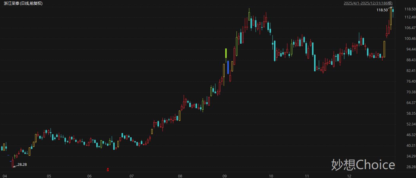 分析师12月29日研报认为,丝杠交付稳步推进,机器人赛道战略布局清晰。浙江荣泰收购狄兹精密、广州金力卡位丝杠、齿轮箱等产品,目前已与国内外多家头部机器人相关公司开展合作,业务推进顺利。同时,泰国工厂正全力推进建设,预计投产在即。公司机器人业务产品开发、量产推进顺利,且战略布局清晰,看好机器人业务带来的增长弹性。二级市场方面,浙江荣泰周三盘中创下历史新高,最高触及118.5元/股,拉长时间来看,其股价自4月低点迄今累计最大涨幅319%。