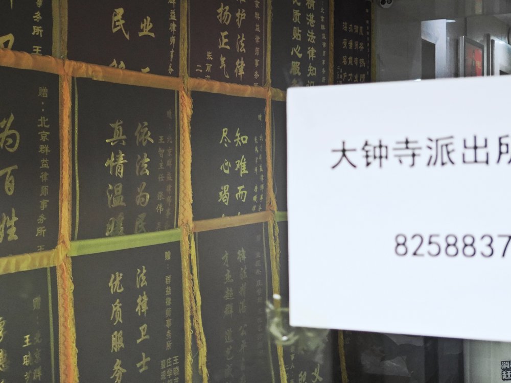 2026年1月9日,北京,北京群益律师事务所玻璃门上贴着派出所电话。赵春芳说,疫情之后,律所的宣传方式由通过扫楼、电话邀请到法律讲座,逐渐转为组织抽奖活动等。赵春芳参加过这样的抽奖活动,“借款”越多,获得的抽奖次数就越多。“我记得奖品就是现金,一等奖超过1万元,纪念奖大概3000元。”(摄影:界面新闻/蔡星卓)