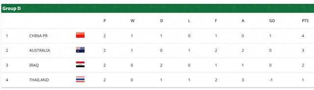 这样,本轮过后,1胜1平的中国队以4分位居小组第一,积3分的澳大利亚队排在第二,而伊拉克队以2分位居第三,泰国队以1分排在第四。