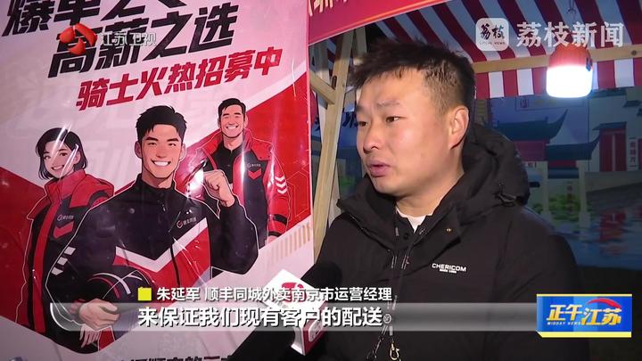 顺丰同城外卖南京市运营经理朱延军:“整个南京市我们可能要招个七八百号人,临近年关了,外卖的压力也比较大,需要大量的运力来保证我们现有客户的配送。待遇的话 工资都是日结,新人过来跑单可能就一天大概200块钱的收入,春节的话我们有额外的激励。”