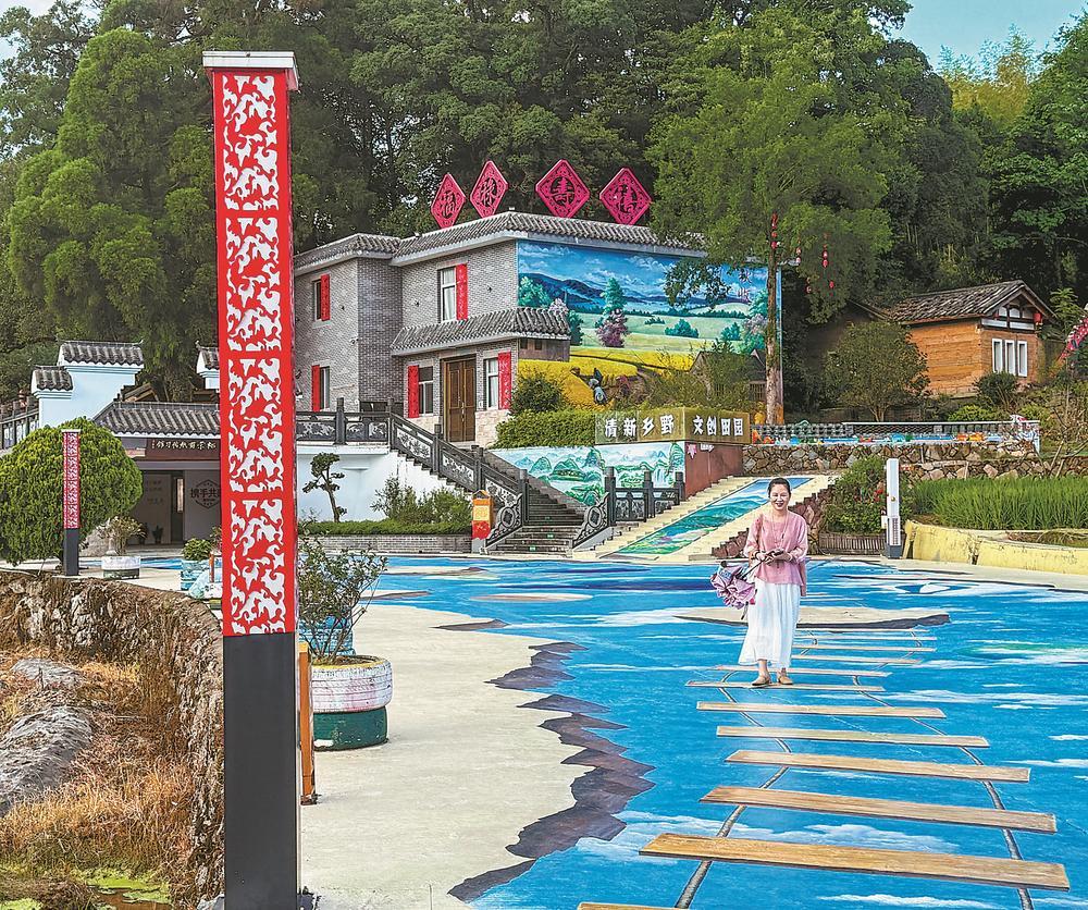 游客漫步靴岭尾村,感受浓浓剪纸文化氛围。