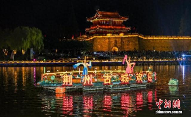 9月30日晚,荆州古城“千年一城满风华”文旅项目全新上线。在宾阳楼前广场上,融合了荆州本土文化元素的灯光秀、无人机表演与登船仪式,带领游客共乘游船,沉浸于光影交织的楚文化画卷。荆州东门、大北门朝宗楼、老南门则用光影秀、市集、特色表演等共同迎接八方来客。图为荆州古城护城河上的表演。肖琦 摄