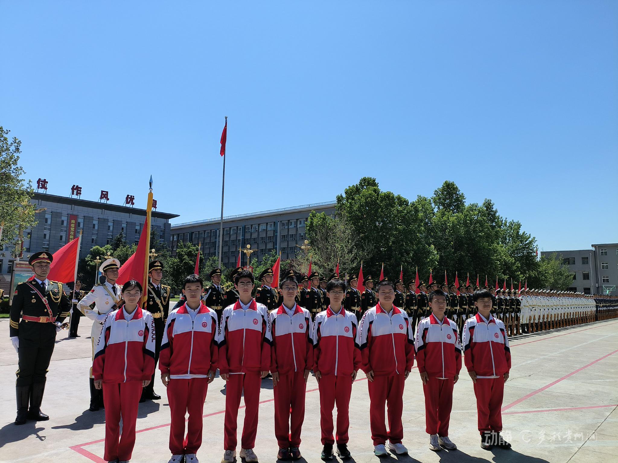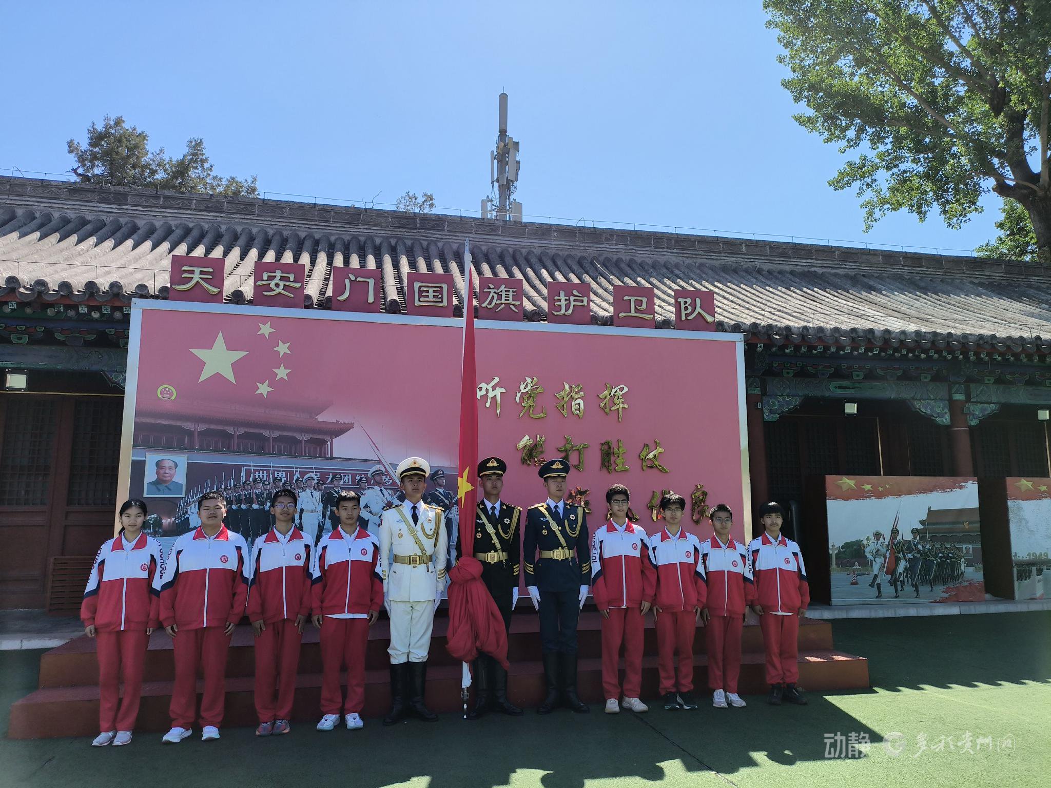 来自天安门的国旗与雷山民族中学之间究竟有什么渊源?一切得从一段帮扶故事说起。2023年,雷山民族中学与北京一零一中教育集团建立帮扶关系,并选派8位同学赴京交流学习。去年6月,8位同学受邀到天安门广场观看升旗仪式,并到中国人民解放军仪仗司礼大队开展国防教育活动。