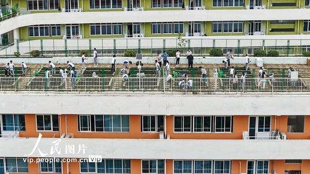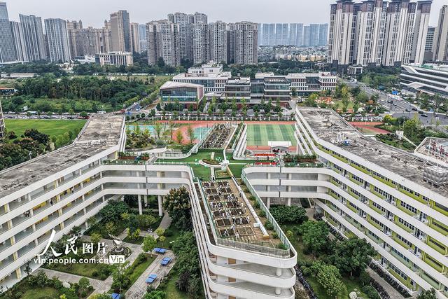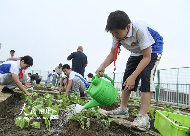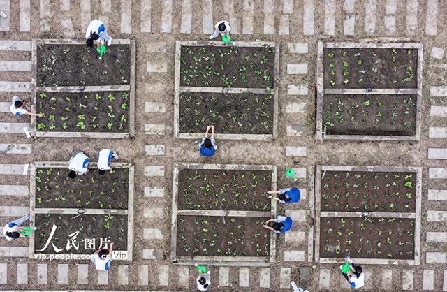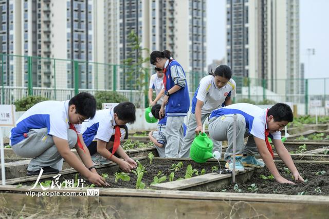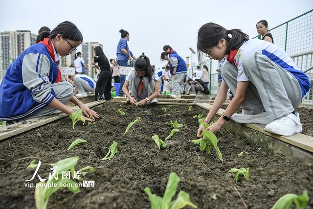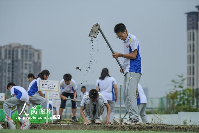 2025年9月30日,四川省成都市中和中学初中部安和校区的学生在教学楼楼顶“空中农田”开展秋季蔬菜播种劳动实践活动。 该校“空中农田”建于2021年,每个班级管理一块“责任田”,让学生和家长共同参与播种管理。李向雨摄(人民图片网)