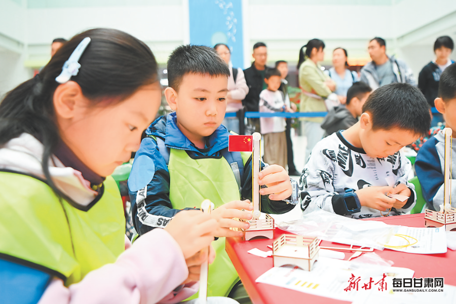国庆假期首日,孩子们在甘肃科技馆参加“红旗飘扬·旗帜传承”国旗升降台制作活动。