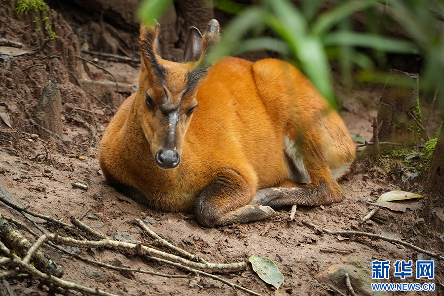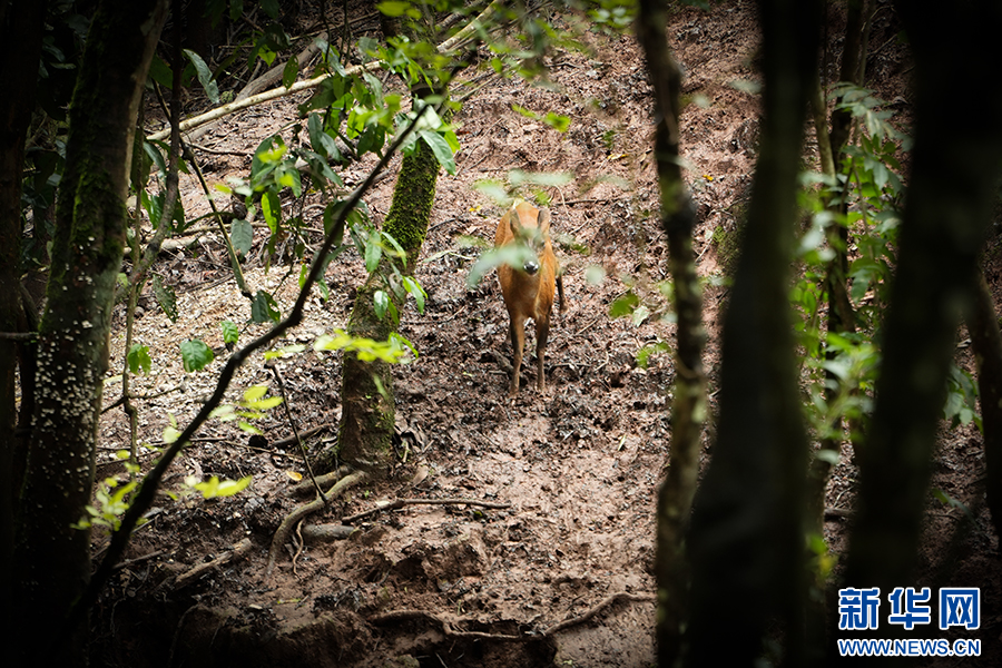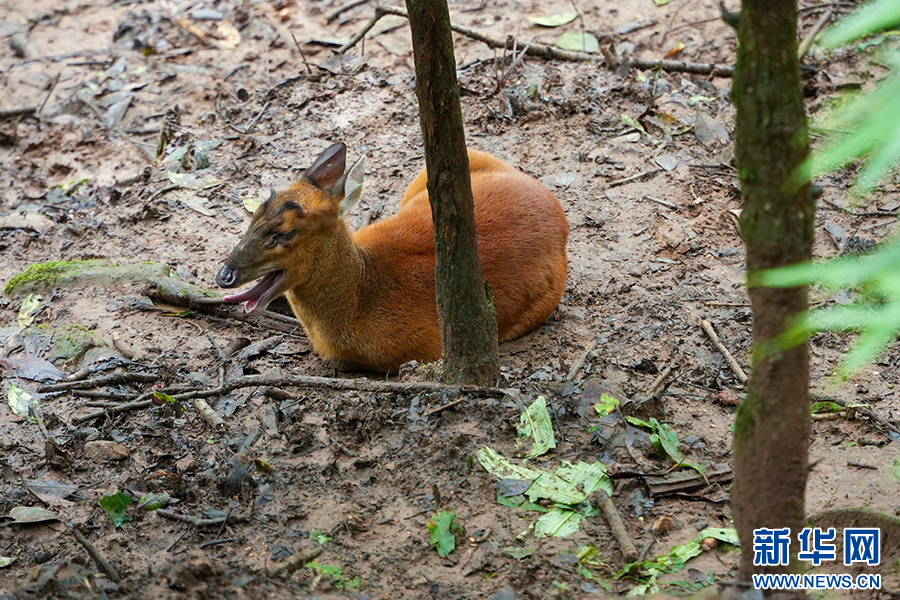 正在打哈欠的赤麂(7月7日摄)。新华网发
