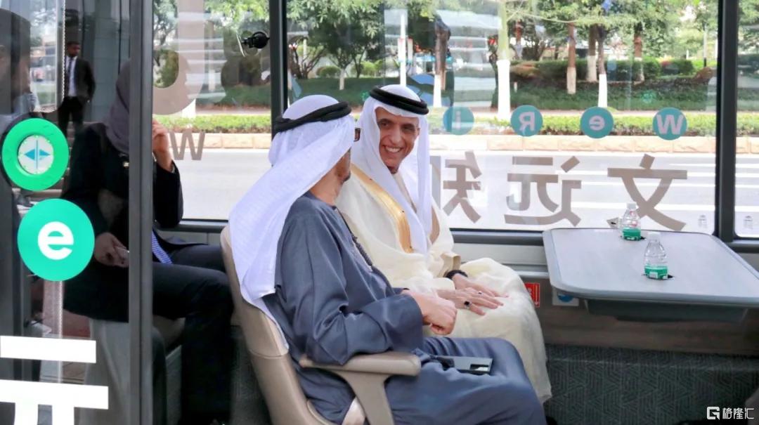 阿联酋哈伊马角酋长His Highness Sheikh Saud bin Saqr Al Qasimi(右一)体验文远小巴