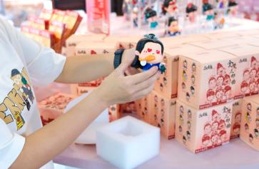 一进院的“C位”,属于南京市越剧团推出的“越金陵”文创产品。“首次发布的产品包括一系列围绕越剧和南京市越剧团经典代表作开发的文创衍生品,比如精巧的徽章、冰箱贴,Q版角色的毛绒娃娃,经典台词钥匙扣,蕴含美好寓意的抱枕、背包等。”南京市越剧团团长李晓旭说。