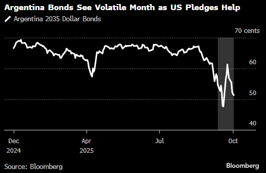 美国财政部长贝森特周四重申对阿根廷的支持,但随后警告称任何援助都不包括美国直接投资,引发阿根廷债券价格大幅波动。